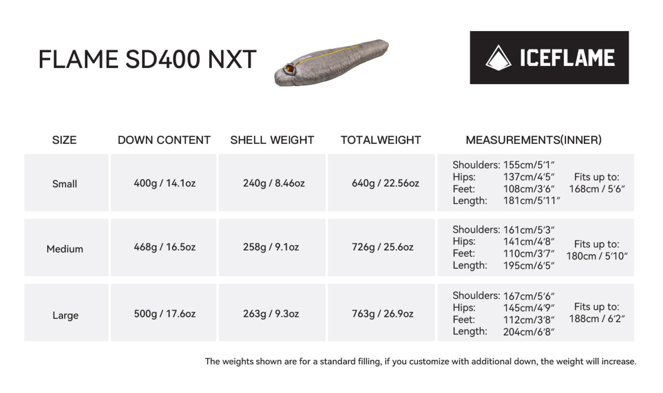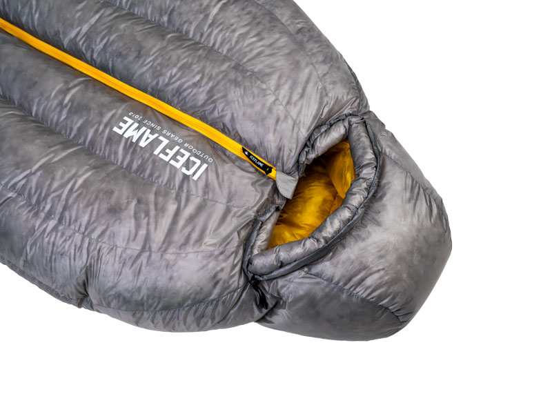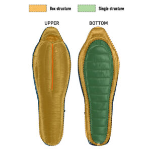 To reduce the weight of the sleeping bag, we designed the back with a simple single-stitch-through structure. Since the down gets compressed while sleeping, the overall insulation will not decrease much when used above -5°C, especially when combined with the sleeping pad straps.